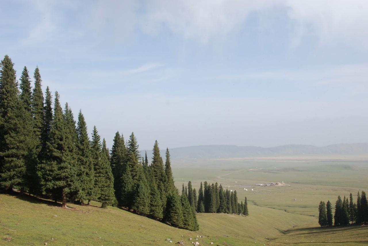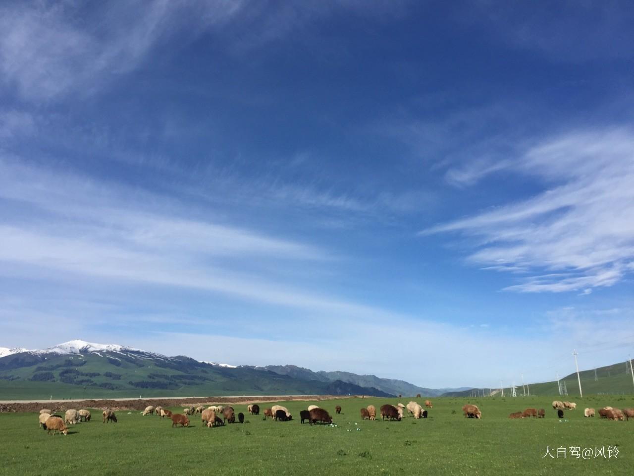 那拉提草原游览,远处的雪峰,湛蓝的天空,悠远的白云,成群的牛羊,绵延的绿色草原,一副自然的画卷尽收眼底