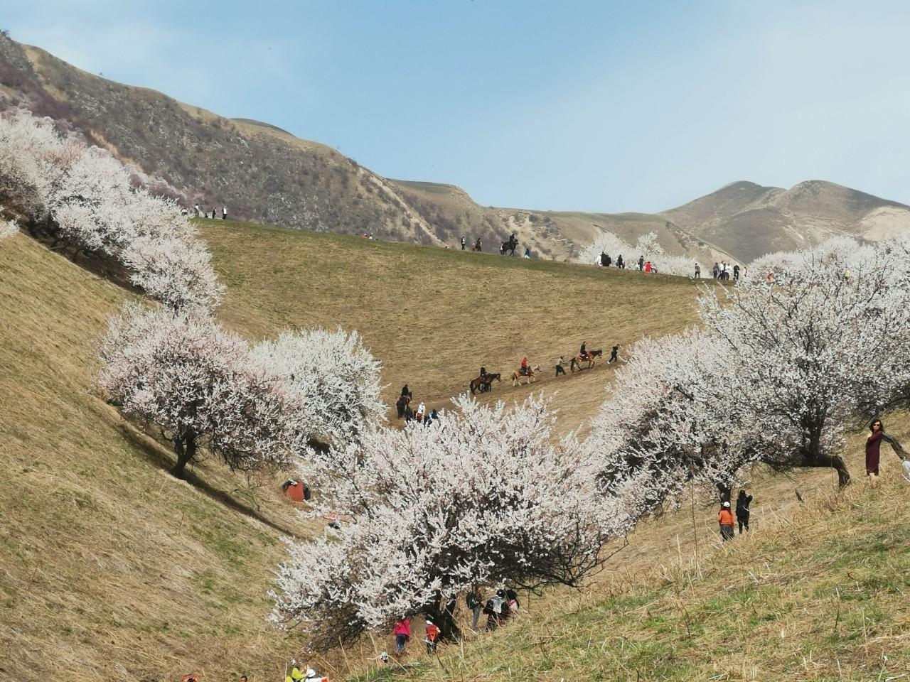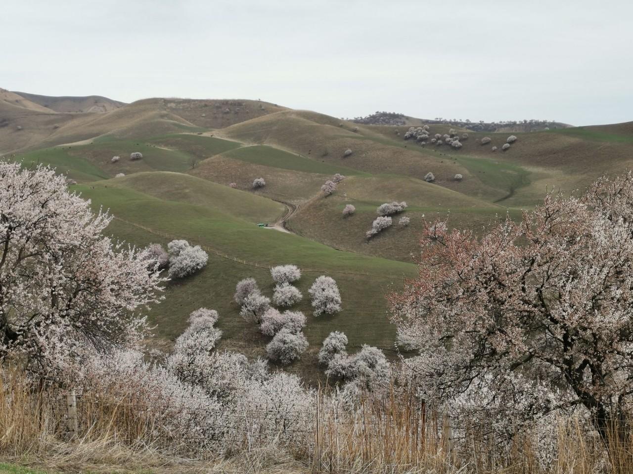 人间四月芳菲尽,伊犁杏花始盛开。杏花枝上着春风,十里烟村一色红。
